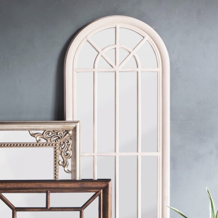 Window-style mirror with an arched top, in an antique white finish. Ideal for adding light to an interior. Also available in a subtle weathered finish.