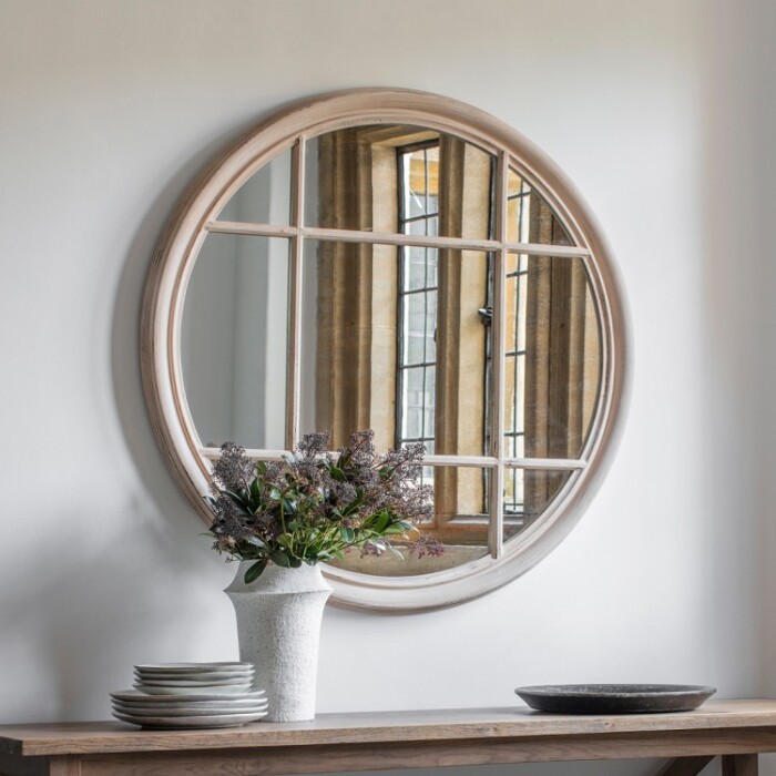 Round window-style wall mirror in a subtle silver finish. Ideal for adding light to an interior.
